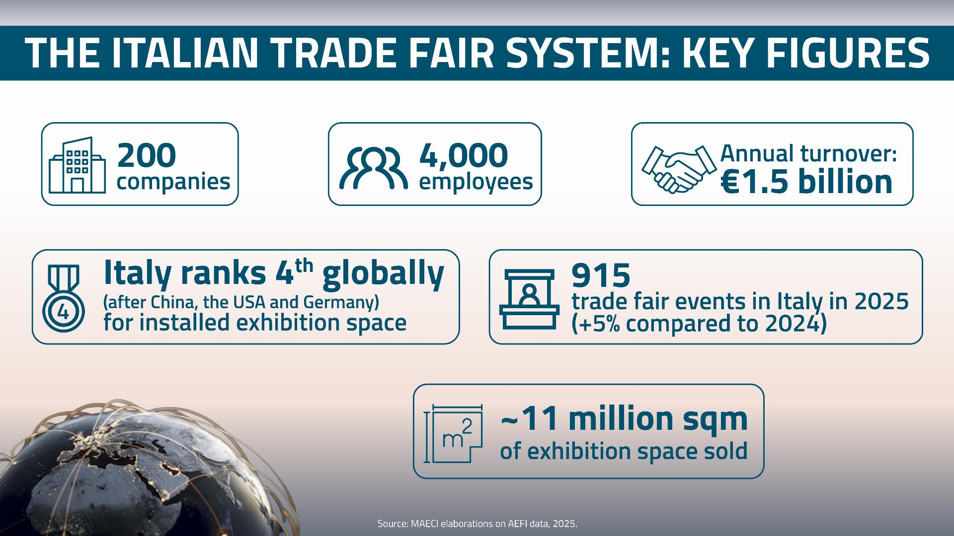 L’Italia è il 4° paese al mondo per superficie fieristica coperta disponibile, dietro a Cina, Stati Uniti e Germania.